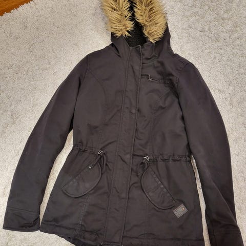 Only puolipitkä toppatakki. Koko XS. On lämmin talvella ja karvareunainen huppu suojaa hyvin tuulelta.