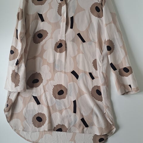 Käyttämätön Marimekko Efria pieni unikko II -tunika, koko 36. 100% silkkiä. Laput kiinni. Kainalo-kainalo n. 50 cm, olka-helma edestä n. 80 cm, takaa muutaman sentin pidempi. Viimeinen kuva Marimekon mainoskuva, josta näkee puseron mallin paremmin.
