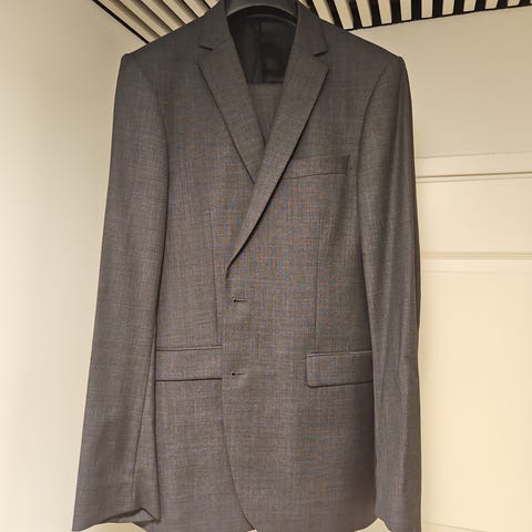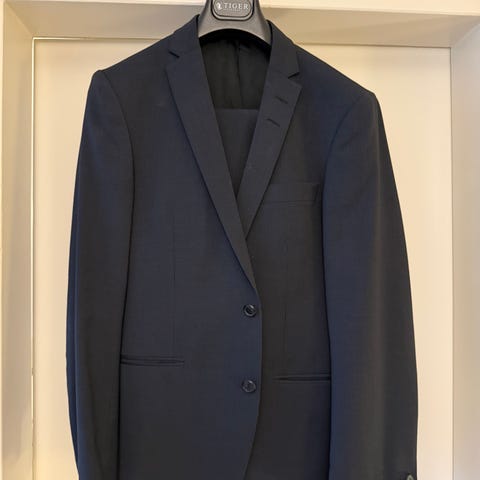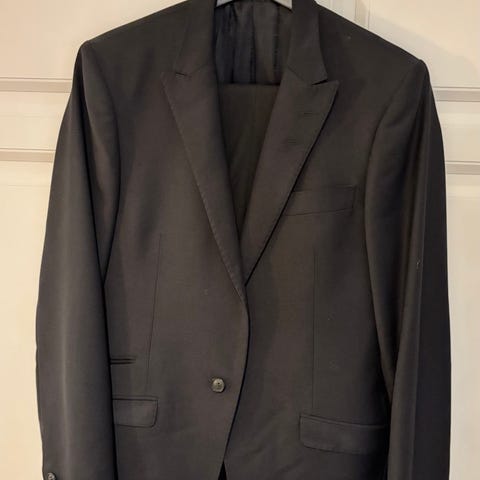 Hyväkuntoinen Tiger of Sweden puku, mustana luonnollisesti. Housut ovat kokoa 152 ja sataprosenttista villaa. Takki on kokoa 154 ja villasekoitetta.