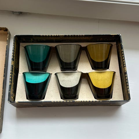 Kaj Franckin (1911–1989) Iittalalle suunnittelemaan Kartio-sarjaan kuuluvat 6 cl snapsilasit. Turkoosi. Korkeus 55 mm, halkaisija 60 mm. Virheettömiä.