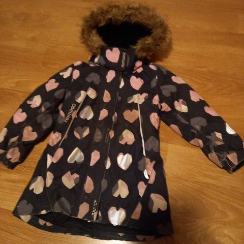 Reiman toppatakki, koko 116cm. Käytön jälkeä löytyy takin helmasta ja hihansuista, muutoin hyvässä käytetyssä kunnossa oleva lämmin takki.