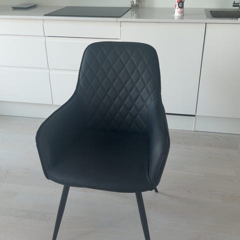 Korkealla selkänojalla varustettu Kruunukalusteesta hankittu nahkainen ruokapöydäntuoli. Pientä ruttua nahkapinnassa, kunnoltaan muuten varsin hyvä. Kuvissa näkyy myös kaveri, joka löysi jo uuden kodin.