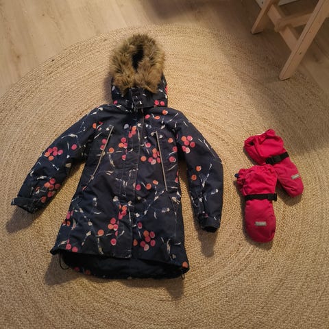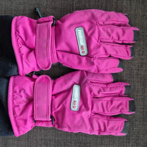 Reima mustat talvihanskat noin kokoa 128-134. Molempien peukaloiden kärjissä pienet reiät, samoin reiät sormien päässä. Eivät pidä noista kohdista enää hyvin vettä. Sopivat esim. varahanskoiksi.