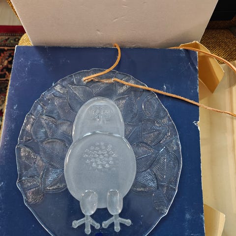 Vanhemmat pienet lasikoristeet, joissa reikä ripustusnauhaa varten. Lintu, sydän ja omena. Moitteettomassa kunnossa, kaikissa tarrat Nuutajärvi.