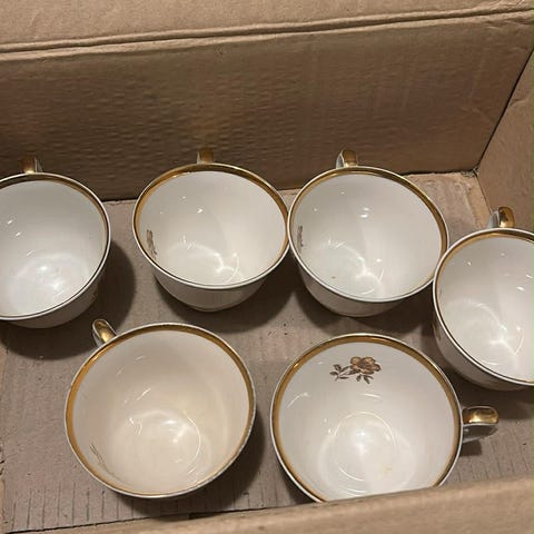 32 osaa, 1 tarjoilulautanen, 11 kahvikuppia aluslautasineen (+ 1 aluslautanen ilman kuppia), sokerikko, kermakko. Virheettömiä, paitsi yhden kupin reunassa lähes huomaamaton kolhu.