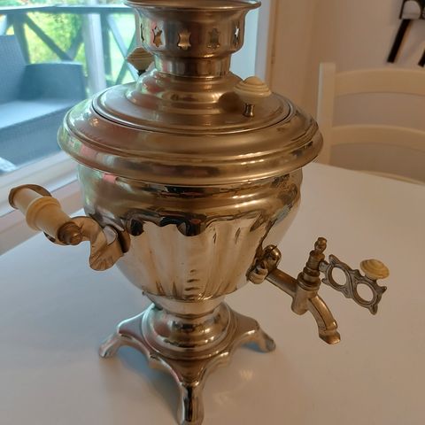 Samovaari, leimoilla ja sähköjohdolla. Ollut koristeena, ei käytössä. Kiiltävä pinta.