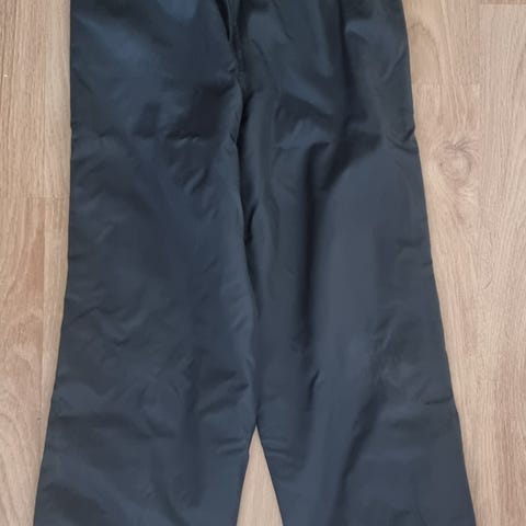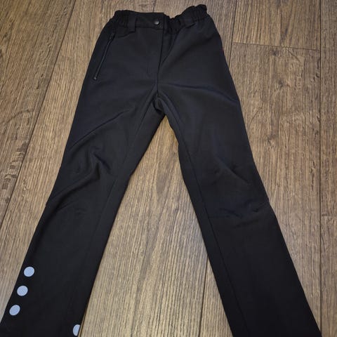 Siistit, ehjät, mustat välikausihousut. Kiristysnauhat vyötäröltä vaihdettu kuminauhaan helpolla kiristyksellä.
