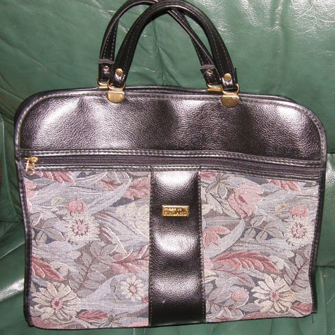 Laukku on ehjä; vetoketju ja neppari toimivat. Kankaasta on lähtenyt joitain hiusmaisia lyhyitä säikeitä. Läpän päällä tumma tahra, joka näkyy kuvissa, mutta joka maastoutuu hyvin kirjavaan kankaaseen. Tästä aikaa nähnyt upea yksilö sesongin juhliin.