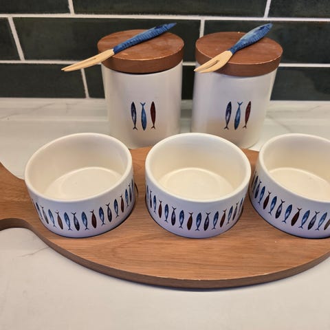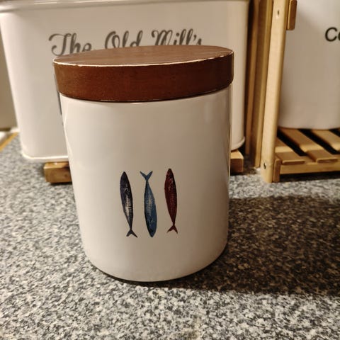 Stailauskäytössä olleet mutta ei sinänsä siis käytetyt siistit keraamiset purkit, tiiviit puiset kannet, kalakuvio, sopii esim. sillipurkiksi, ovat n.0.5l, tulitikku aski kertoo mittasuhteet. Vain molemmat 2kpl yhdessä yhteishintaan noudolla 15€ tarkka aika etukäteen sovitusti ma-pe kl.10-16 Hki88