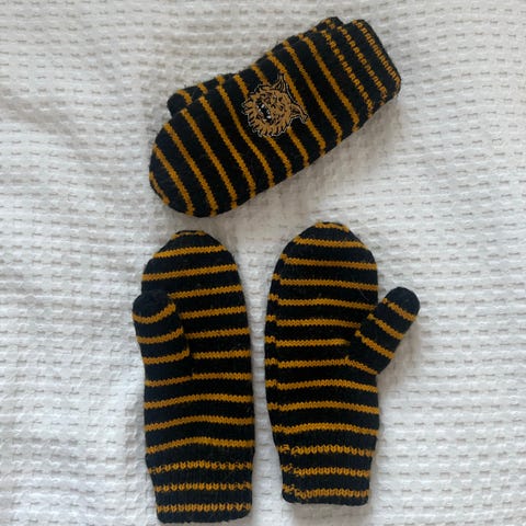 Ilves, "lätkälapaset" Koko, kämmenen pituus 18 cm, ympärys 18 cm. Lanka Maija, 85 % villa 15 % polyamidi. Uudet.