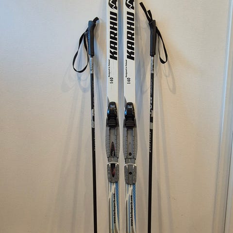 Käytetyt Karhu lasten sukset 135cm mitattuna. SNS side. Pieni pala pois toisesta kärjestä mutta ei haittaa hiihtämistä.
