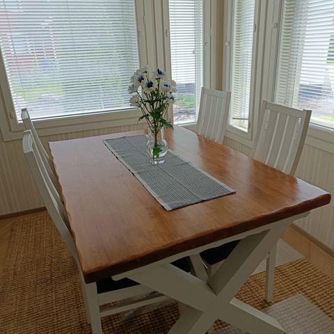 Pöytä ja neljä tuolia. Käsityötä. Uniikki.
