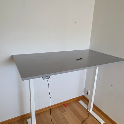 Valkoinen korkeussäädettävä työpöytä. Iso kokoinen pöytälevy mille mahtuu hyvin kaikki tarvittava. Pöytälevyssä pieniä käytön jälkiä mutta yleisesti hyvin siisti. Jäljet kuvissa.