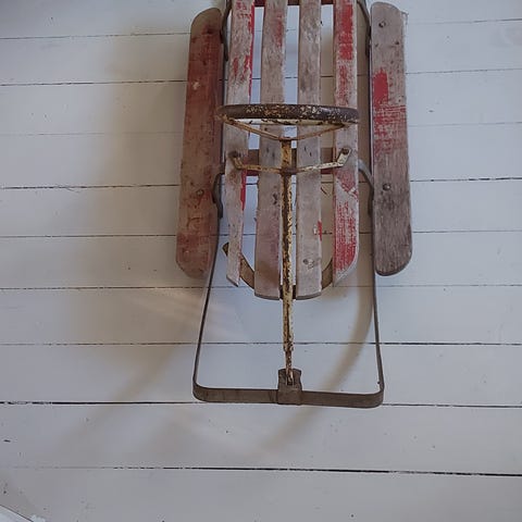 Vanha toimiva rattikelkka, käsityönä tehty.