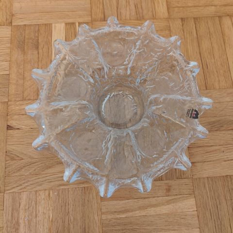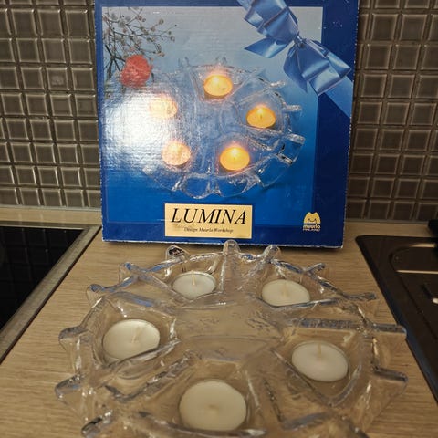 Myydään Muurla jääkidetuikkualusta 3:lle tuikulle, kirkas lasi. Halkaisija noin 20 cm.