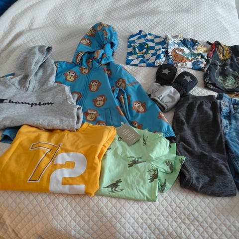 Vaatepaketti 134-14cm. Ehjiä, mutta kulumaa saattaa näkyä.