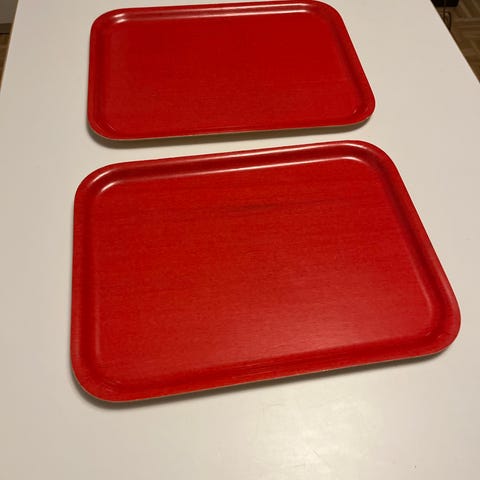 Kaksi retroa tarjotinta, joista toinen seinätelineellä. Oranssin tarjottimen korkeus 18 cm ja leveys 30 cm. Mustan kukkatarjottimen halkaisija 33 cm. Myydään yhteishintaan 10 euroa. Postitus onnistuu.