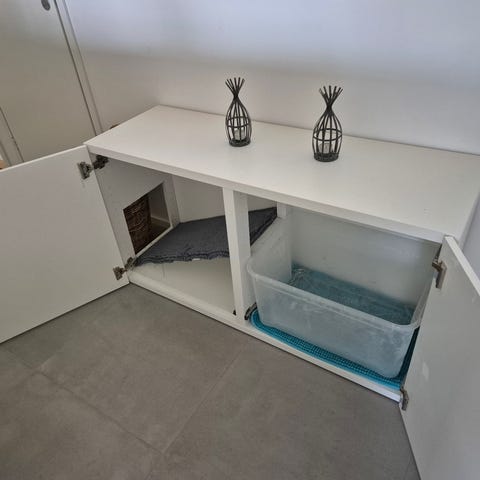 Kissankaappi, ei sopinutkaan meille joten myyntiin joutaa. Säilytetty kissan ruokia ja kippoja pelkästään