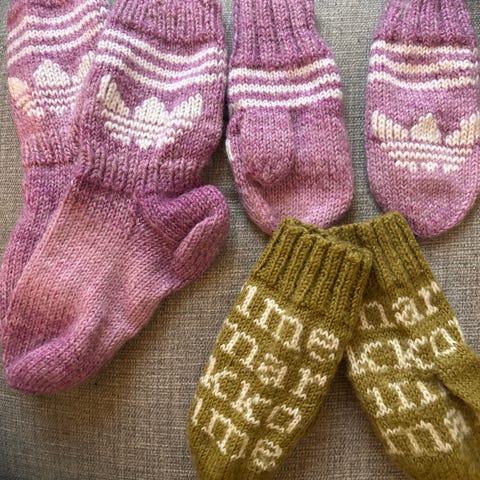 Tummanruskea setti : villasukat ja lapaset pienelle, noin 1-2 -vuotiaalle.