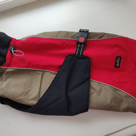 Siisti käytetty koiran talvimantteli/ talvitakki. Selkäosassa toppausmja fleecevuori. Ehjä ja lukot toimivat. Heijastin tereet myös toimivat