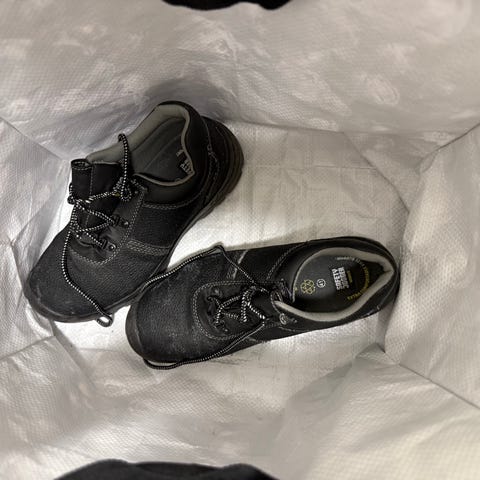 Safety Jogger -turvanilkkurit/kengät, jotka hankittu pakolliseksi varusteeksi lyhyelle työmaakeikalle. Käytetty vain parin päivän ajan – sen jälkeen jääneet tarpeettomiksi.