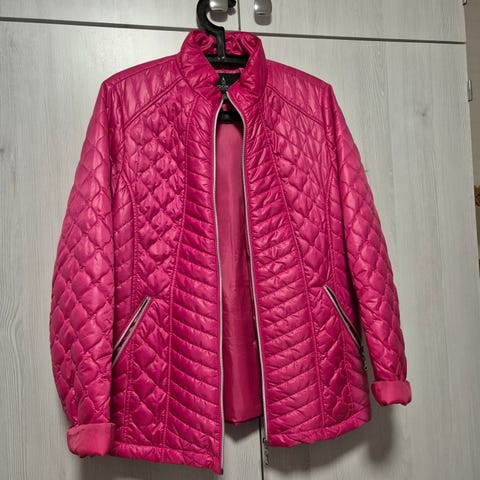 Takki tikkivuorella. Ehyt, vain muutaman kerran käytetty. Kivoja yksityiskohtia kuten vetoketjut hihansuissa ja vaivistetut kyynärpäät. Vyön saa pois.