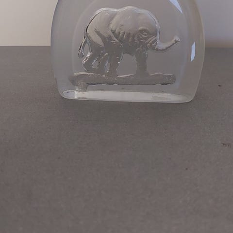 Myynnissä kuvien ehjä lasinen norsu / elefantti. Korkeus on 8,5 cm, leveys 8 cm. Lähetän ja kulut ovat 7 e