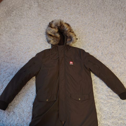 Puolipitkä ehjä ruskea-tummanharmaa fleece Vuorinen takki. Edessä rintataskut ja 2 muuta taskua. Edessä metallinen vetoketju ja nepparilista.