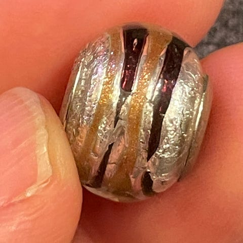 Venetsiasta ostettu kaunis Muranon lasista valmistettu hela. Turkoosista pohjaväristä vaaleanpunaiset, siniset, kullanväriset ja vihertävät kuviot näkyvät kauniisti. Hela sopii mm. Pandora-rannekoruihin.