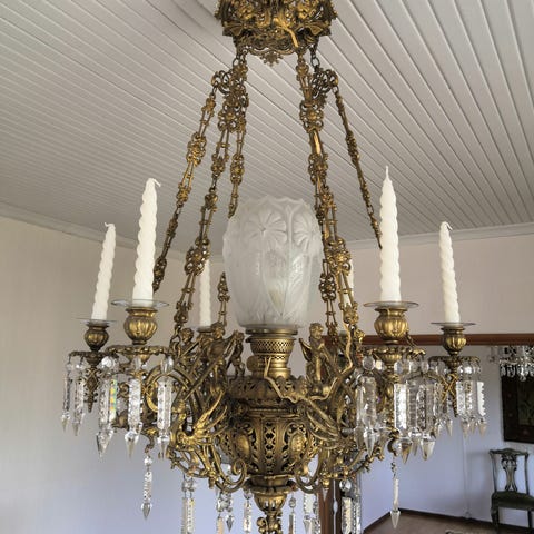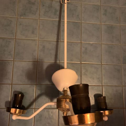 Upea vanha kruunu, jossa alabasterivarjostimet. Runko metallia. Toimiva, sähköt uusittu alan liikkeessä 2023.