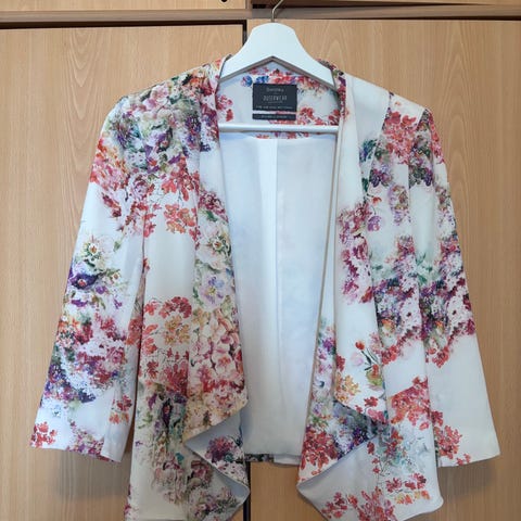 Ryhdikäs ja kaunis, suora malli. Upeita yksityiskohtia. Materiaali on ajattoman tyylikästä bukleekangasta.