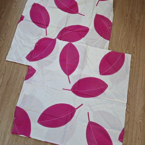 Kaksi punasävyistä tyynyliinaa, koko 50x60 cm. Hyvä käytetty kunto. Kuosi on joko Tiheys tai Keveys (Kristiina Isola).
