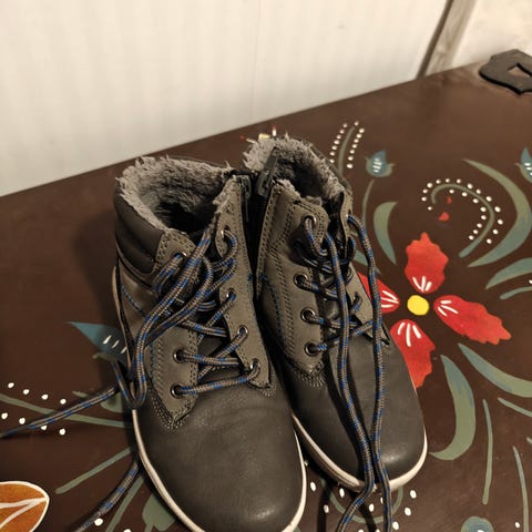 Kuvan mukaiset nahkatöppöset pois liian pieninä. Ihan muksun suosikkeja ollut, ns "kauppakengät" ei päiväkotiin.