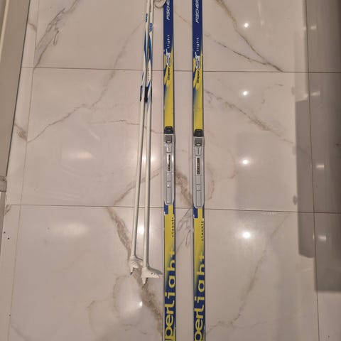Fischer sukset (191 cm) NNN-siteillä ja Exel Nova -sauvat (140 cm) perinteiselle tyylille. Pohjissa normaaleja käytön jälkiä.