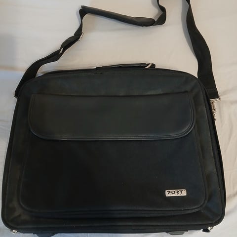 Hyvässä kunnossa oleva nahkainen tietokoneen kantolaukku.