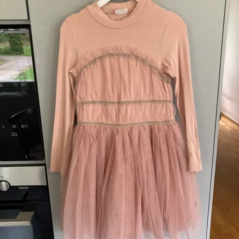 Mekon pituus n. 53 cm. Kainalo-kainalomitta n. 34 cm. Mittauksista kuvat. Mitat eivät ole ammattilaisen ottamia, joten pieni varaus niihin. Päällimmäisessä tyllikankaassa on pakenemia ja yhden reiän havaitsin. Moitteet havaittavissa tarkastelemalla kangasta kerros kerrokselta valoa vasten, joten ei käytössä virheitä ei havaitse.