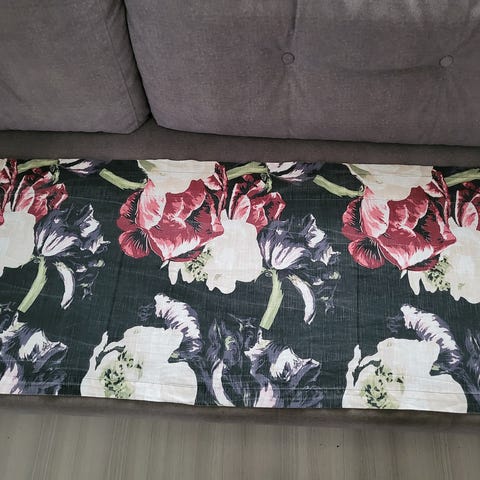 Kaunis luontoaihein kuvioitu verhokappa. Nyt hieman rypyssä varastoinnin jäljiltä.
