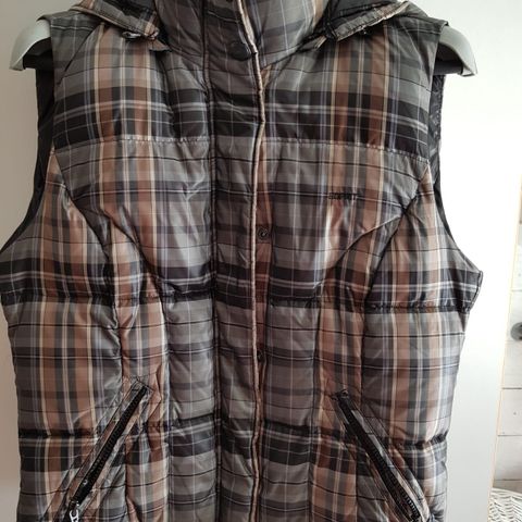 Ruskea Esprit kevyttoppaliivi kauluksella ja kahdella taskulla. Sisäpuolella vielä povitasku. Kiristysnauhat sisäsivuilla. Vetoketju- ja nepparikiinnitys. Koko 36/S.