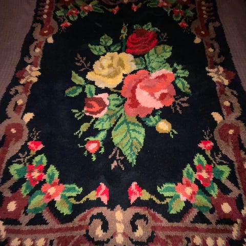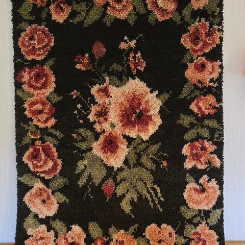Myydään: Hieno Ruusu-Ryijy Puhdas, ja hajuton. Mitat: Korkeus 176 cm + hapsut 15 m leveys 118 cm