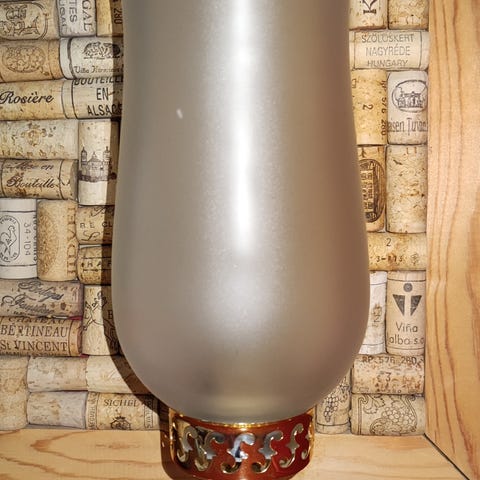 Lumihiutalekoristeinen hurrikaani kynttilälle. Yläosan hopean värisessä reunuksessa kulumaa värissä, mutta ei muita moitteita.