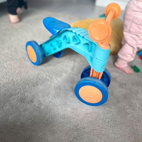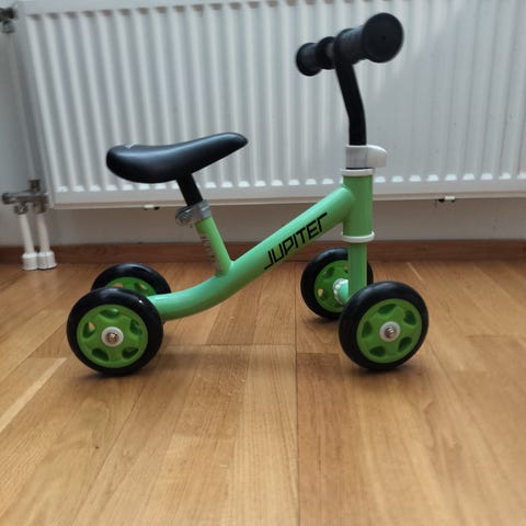Puinen hevosaiheinen potkupyörä lapsille. Leikkikalussa on harmaa runko, punainen satula ja siniset pyörät. Rakenne on nelipyöräinen, etupyörät ovat kääntyvät ja taka-akseli yhdistää takapyörät. Hevosen päässä on puiset kahvat ohjaamista varten. Sopii lapsen tasapainon ja motoriikan harjoitteluun sisä- tai ulkoleikkeihin käyttäjän valitsemalla tavalla.