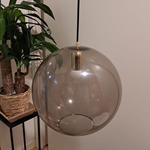 Ideal Lux:n Italialaista desingia oleva lasivalaisin. Mitat löytyvät kuvista. Kyseessä Big, eli isompi valaisin. Teräskaapelissa säätövaraa. Poltin max. 1 x 60 W, kanta E27. Valaisin täysin moitteettomassa kunnossa.