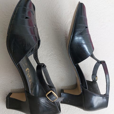 Brasiliasta hankittu mustaa nahkaa olevat nyörisandaalit. Korko 7cm. Sisävuori kullan värinen. Korkolaput tippuneet eli ne pitää lisätä suutarilla, muuten kengät ovat hyvässä kunnossa. City shoes made in Brazil