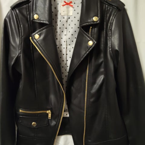 Hyväkuntoinen tyttöjen musta, ohutvuorinen keinonahkatakki. Ostettu H&M:ltä. Ollut yhdellä lapsella muutaman kerran. Vino vetoketju edessä, vetoketjutaskut. Koko 140cm.