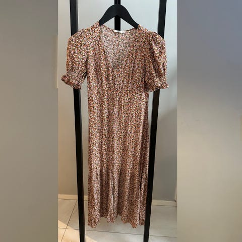 Pitkähihainen mustavalkoinen kukkamekko koossa XS. Hyväkuntoinen!