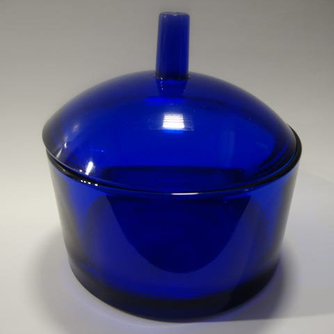 Sininen Markku Salon Kuninkaiden laakso signeerattu taidelasi. Kokonaiskorkeus n 21 cm, leveys n 14,5 cm. Sisäpuolella yksi isompi ja pienempi särö. Eivät näy ulkopuolelle. Ostaja maksaa postimaksun.