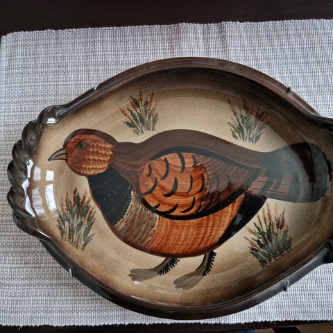 GOG käsinmaalattu lintu taidelautanen kooltaan 37 x 28 cm. Takana seinäkiinnikkeet ja teksti Arabia Finland GOG/PM.
