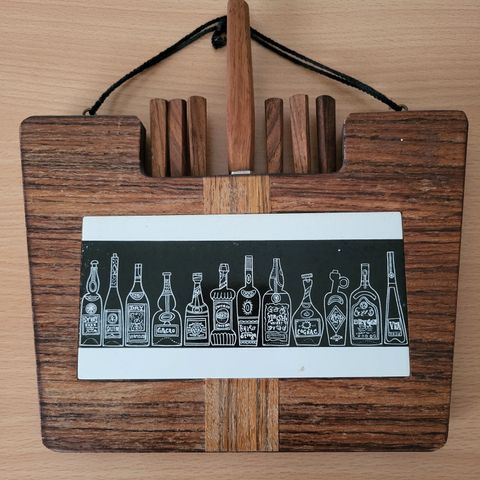 Juustotarjotin puinen ja siihen ottimet, magneetti reunassa johon saa ne kiinni