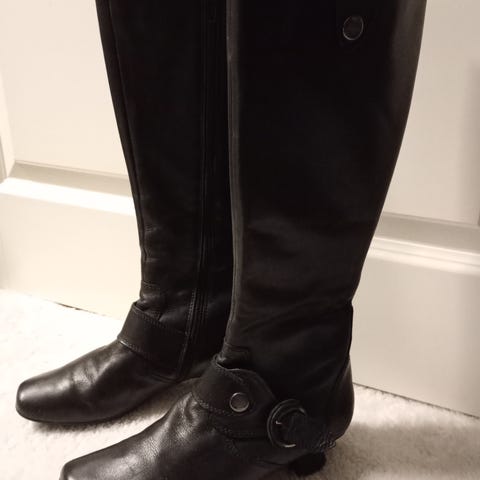Saapikkaat, tummanruskeaa nahkaa, vain vähän käytetyt. Merkki Gabor. Varren leveys 35 cm. Ei siis ihan kapea. Sisäpituus kuten koossa 5 yleensä, tavallinen Gaborin koko.