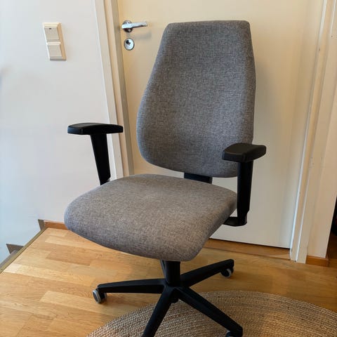Verkkoselkänojainen Topstar-työtuoli käsinojilla. Tuoli on Kuopion toimipisteessä mutta liikkuu tarvittaessa sujuvasti toimipisteiden välillä.